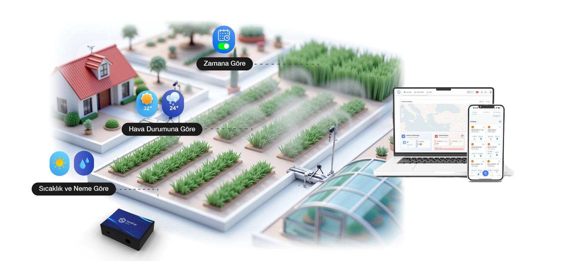 - Agrometeoroloji verilerine göre; toprak nemi, sıcaklık, yağış miktarı, rüzgar hızı gibi çevresel faktörlerden yararlanarak sulama süreçlerinin optimize edilmesi