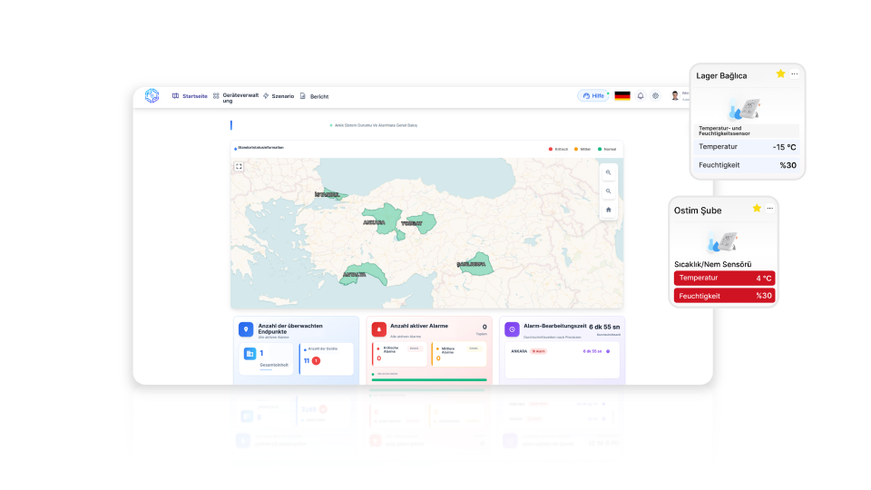 Tüm paketleme, depolama, taşımacılık ve muhafaza süreçlerinde ortam koşullarını anlık olarak izlenebilir hale getirilir, kritik durumlarda e-posta, SMS, mobil uygulama bildirimi ve arama yoluyla anında ilgili kişiye bilgi gönderilir.
